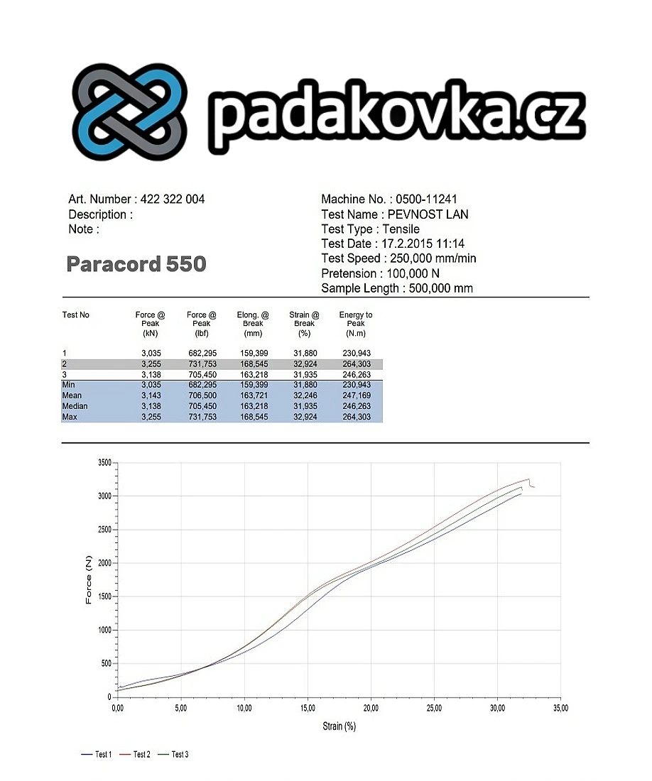 - Česká padáková šňůra - Paracord 550 je známá svou vysokou pevností v tahu, což je zajištěno použitím polyamidu jako základního materiálu.